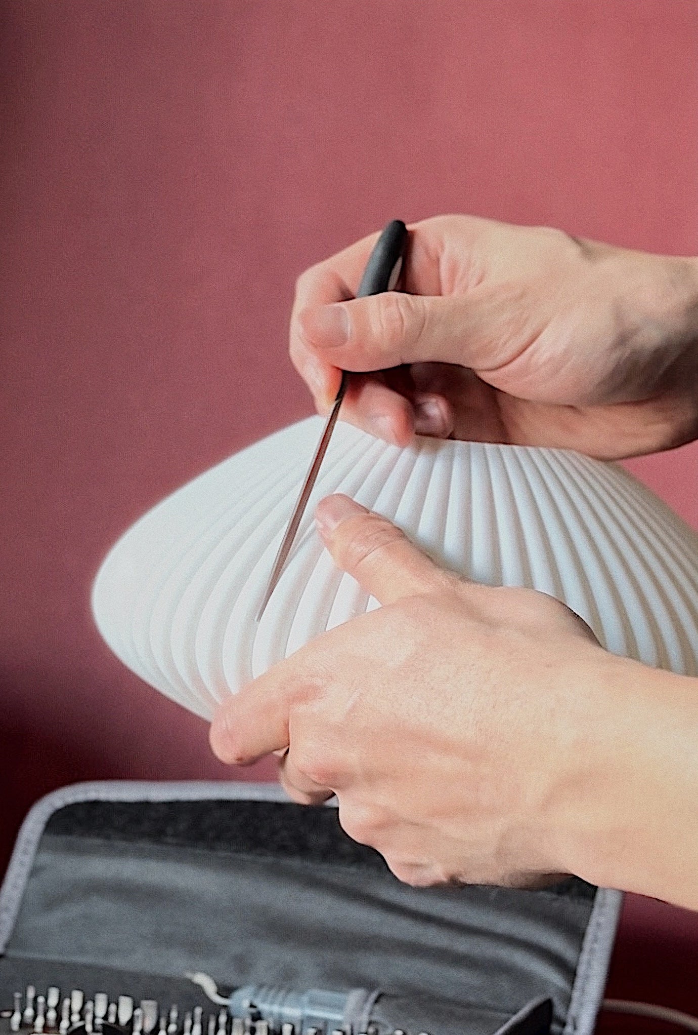Unni features a distinctive tiered silhouette, reminiscent of soft, floating clouds. The unni lamp shade features a flutted detailed finish with just the right amount of transparency to diffuses light gently. Creating a serene and inviting ambiance perfect for any contemporary space. Unni was inspired by the shapes and forms of uni - the Japanese word for sea urchin.